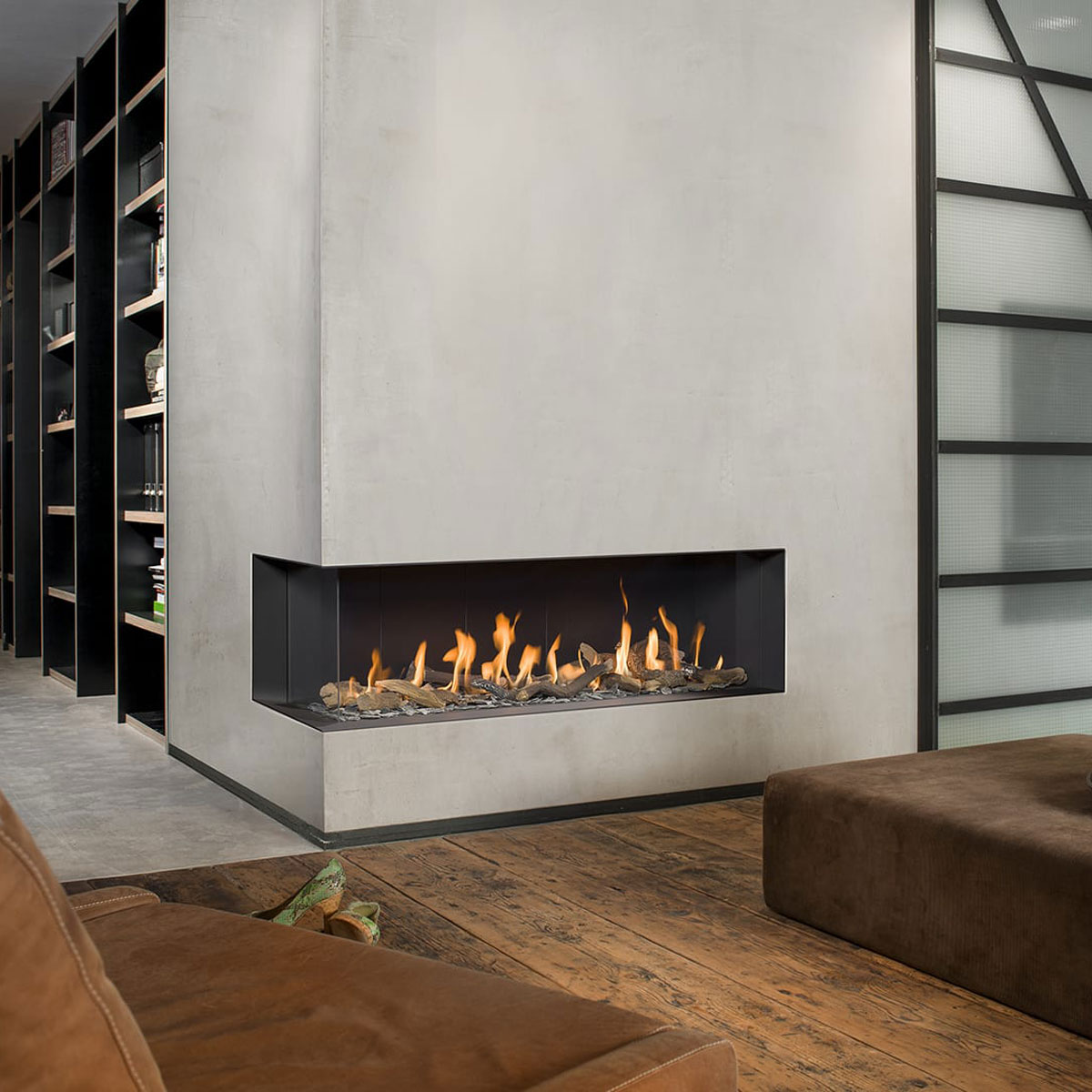 Spacious and stylish corner fireplace, designed to enhance modern interiors with efficient heating.