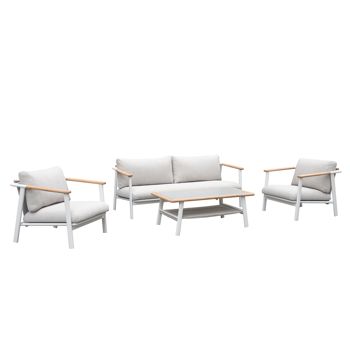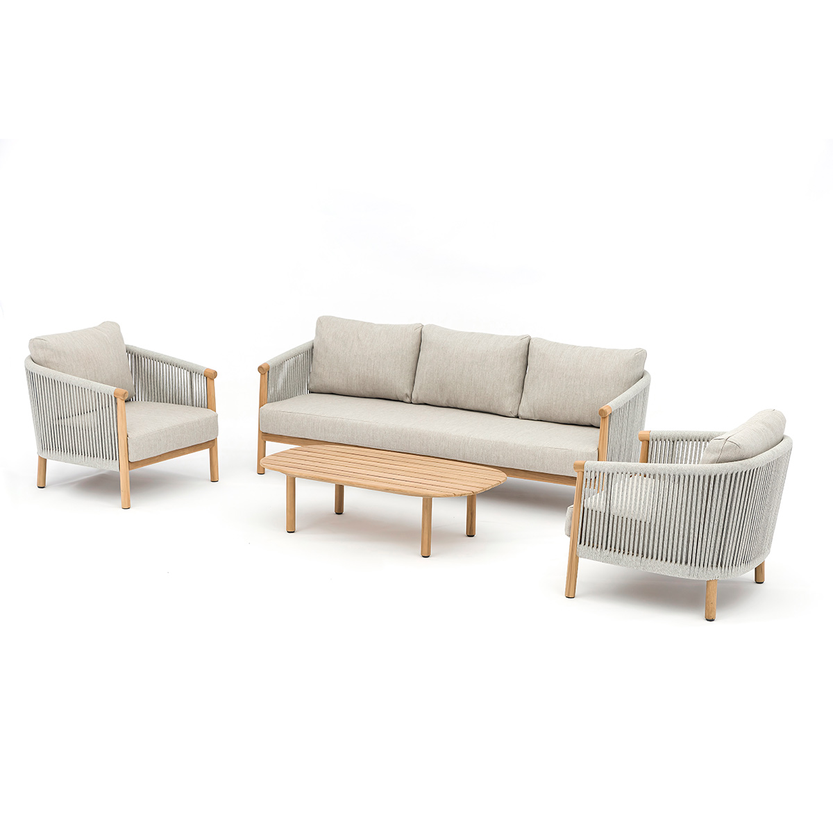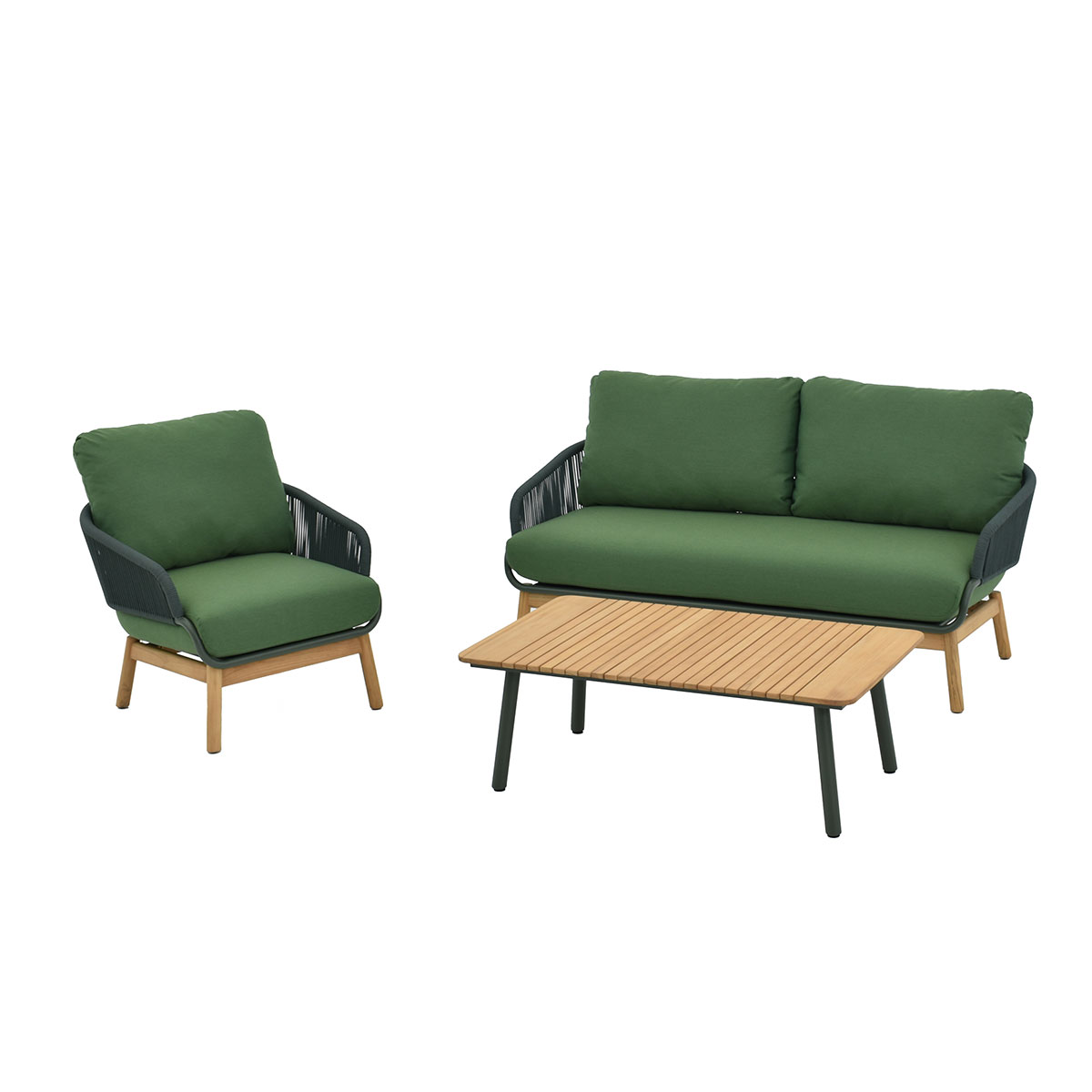 Akka Set : 3 seater + 1 seat + coffee table Akka Loveseat with FSC Teak Base in Green Akka