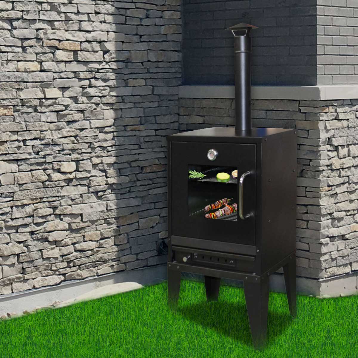 – The door is equipped with a tempered glass to allows us don not have to opent the door to control the roast.