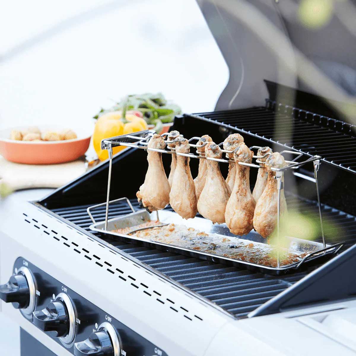 -Includes tray to catch dripping grease.