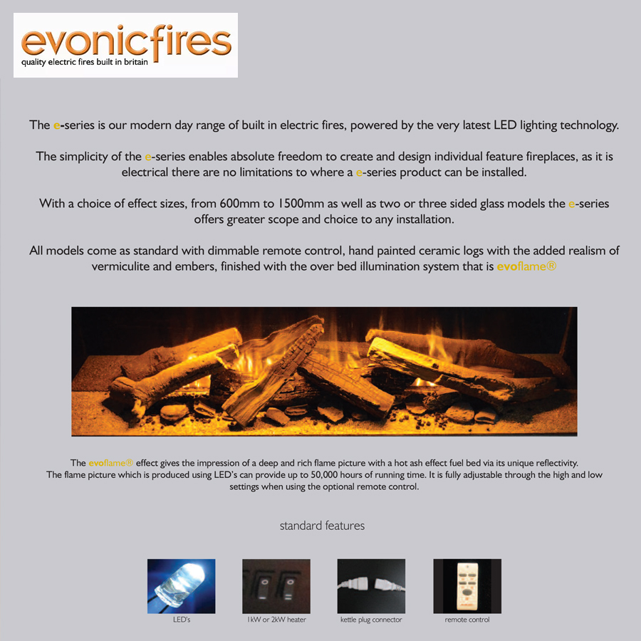 The e-series is our modern-day range of built in electric fires, powered by the very latest LED lighting technology.