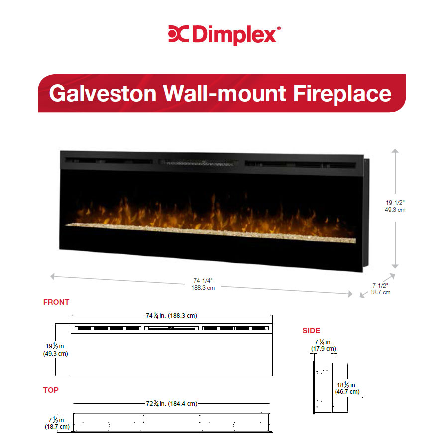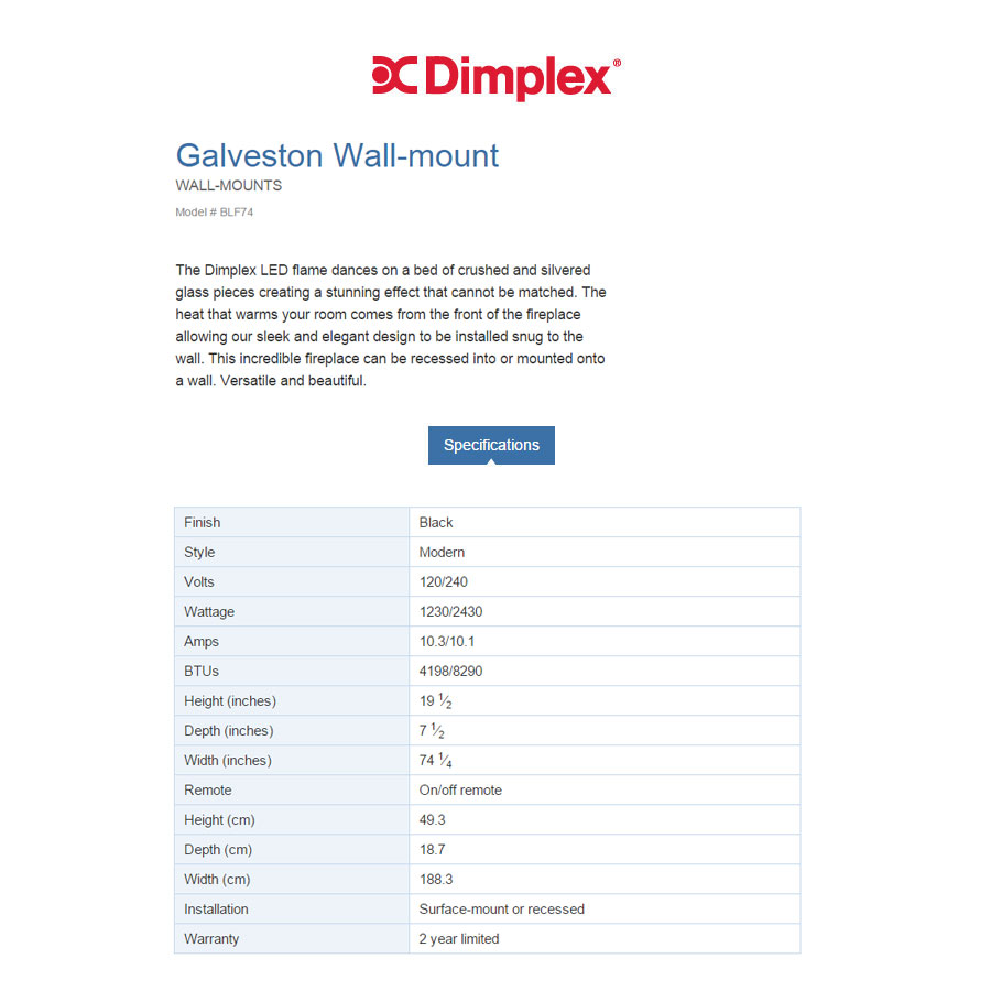 The Dimplex LED flame dances on a bed of crushed and silvered glass pieces creating a stunning effect that cannot be matched. The heat that warms your room comes from the front of the fireplace allowing our sleek and elegant design to be installed snug to the wall. This incredible fireplace can be recessed into or mounted onto a wall. Versatile and beautiful.