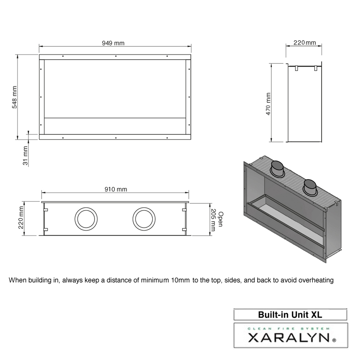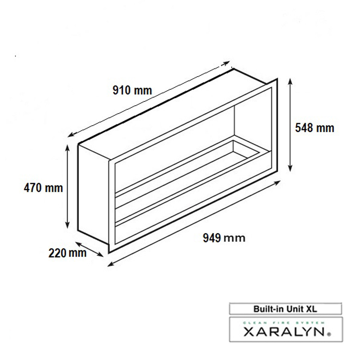 The Xaralyn built-in unit XL is supplied in combination with the bioethanol burner XL (8014LB). The built-in unit protects the fireplace or piece of furniture against the heat produced by the bioethanol burner.