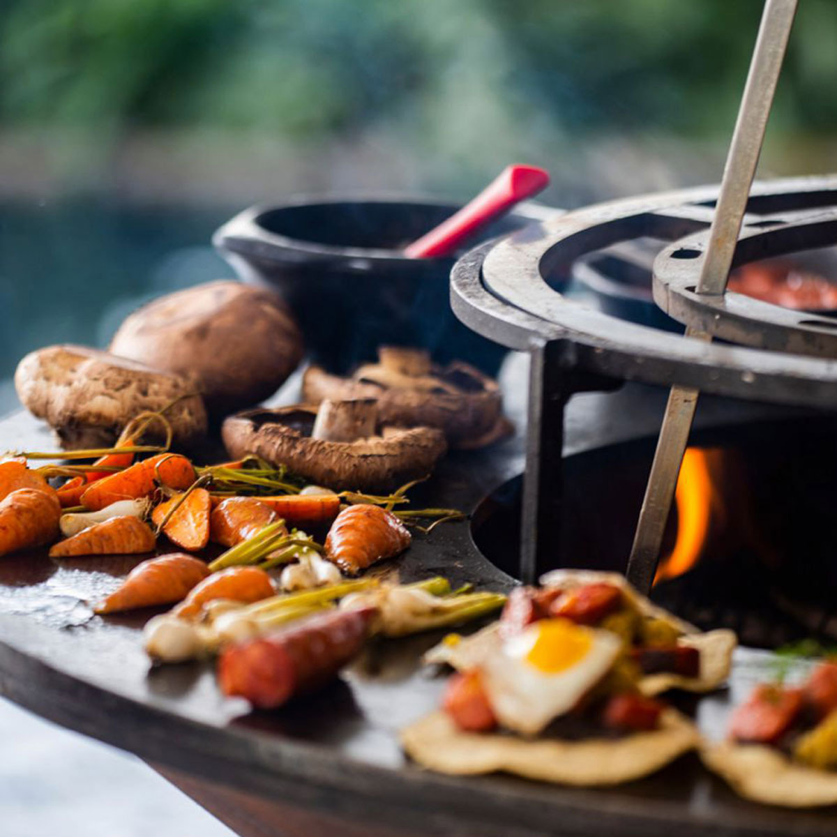 Convert your OFYR classic 100 into a Brazilian style barbecue with this set of three skewers in a circular steel stand. The skewers have wooden handles for easy handling and allow slow cooking of meat directly over the fire.