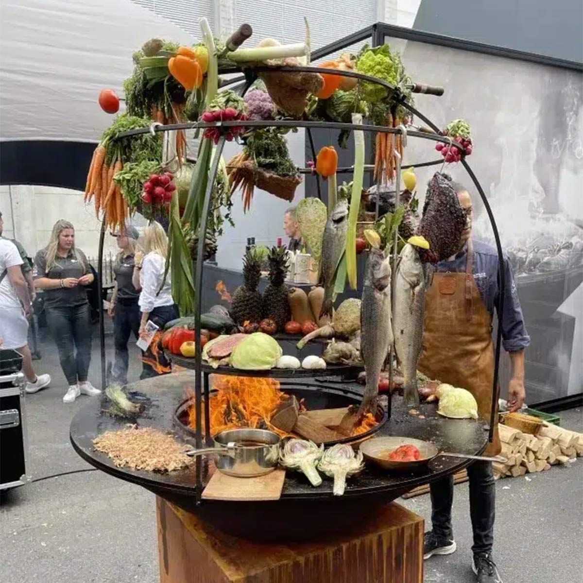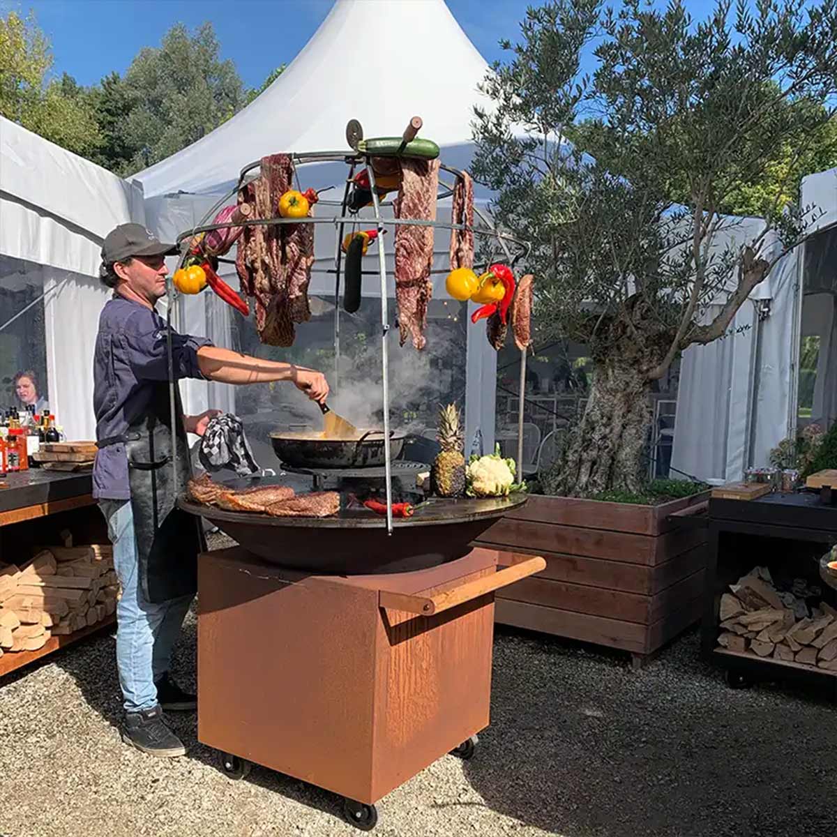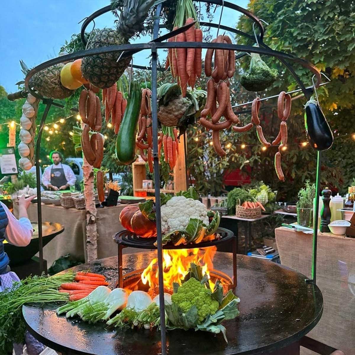 The OFYR Cage is the perfect accessory for professionals who love to show cook. Its dome-like structure allows food to be suspended from the steel beams, creating a unique and interactive visual element. The heat from the fire slowly cooks ingredients, from meat and fish to fruits and vegetables. Since the Cage is secured on the outer edge of the plate, the cooking surface remains free to prepare other dishes. Ingredients can be suspended from the beams with skewers and s-hooks.