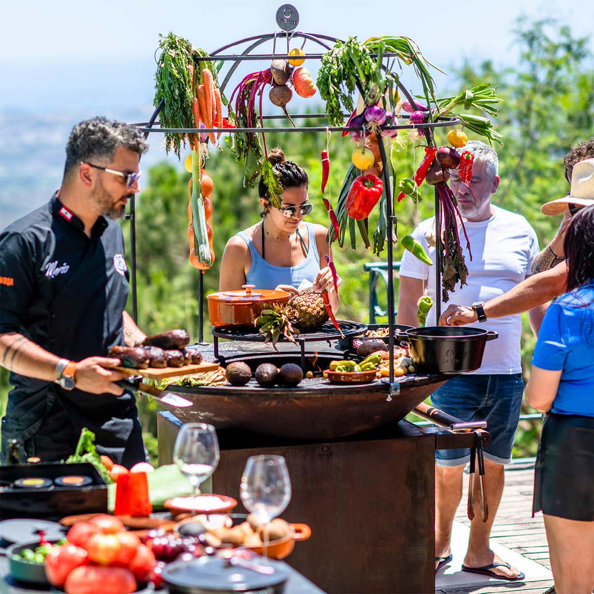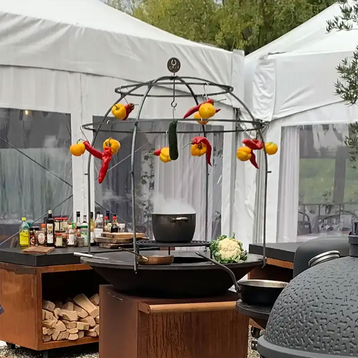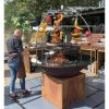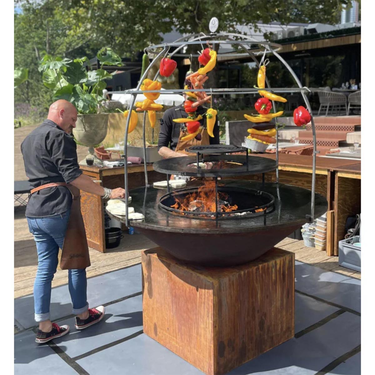 The OFYR Cage is the perfect accessory for professionals who love to show cook. Its dome-like structure allows food to be suspended from the steel beams, creating a unique and interactive visual element. The heat from the fire slowly cooks ingredients, from meat and fish to fruits and vegetables. Since the Cage is secured on the outer edge of the plate, the cooking surface remains free to prepare other dishes. Ingredients can be suspended from the beams with skewers and s-hooks.