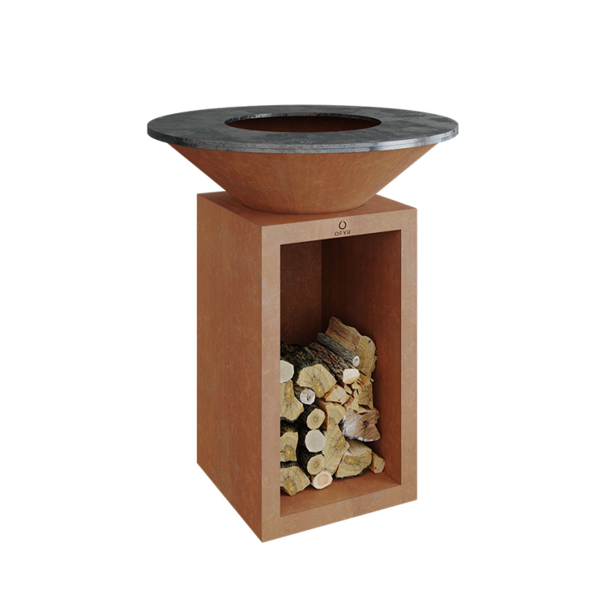All the style and simplicity of the OFYR cooking unit, with the added convenience of built-in wood storage.