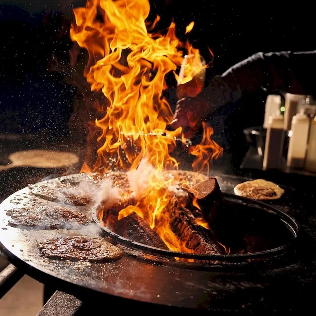 The cooking plates of the OFYR cooking units run slightly downward towards the center. When the cooking plates are heated, the center will drop a little further down. The result is that around food such as tomatoes but also very fatty food can roll or slide to the center of the cooking plate and fall into the fire. To avoid this, the OFYR Food Bumper has been developed. The raised steel rim stops the food but still offers the possibility to scrape the cooking plate clean with the spatula and push the scrape under the rim into the fire.