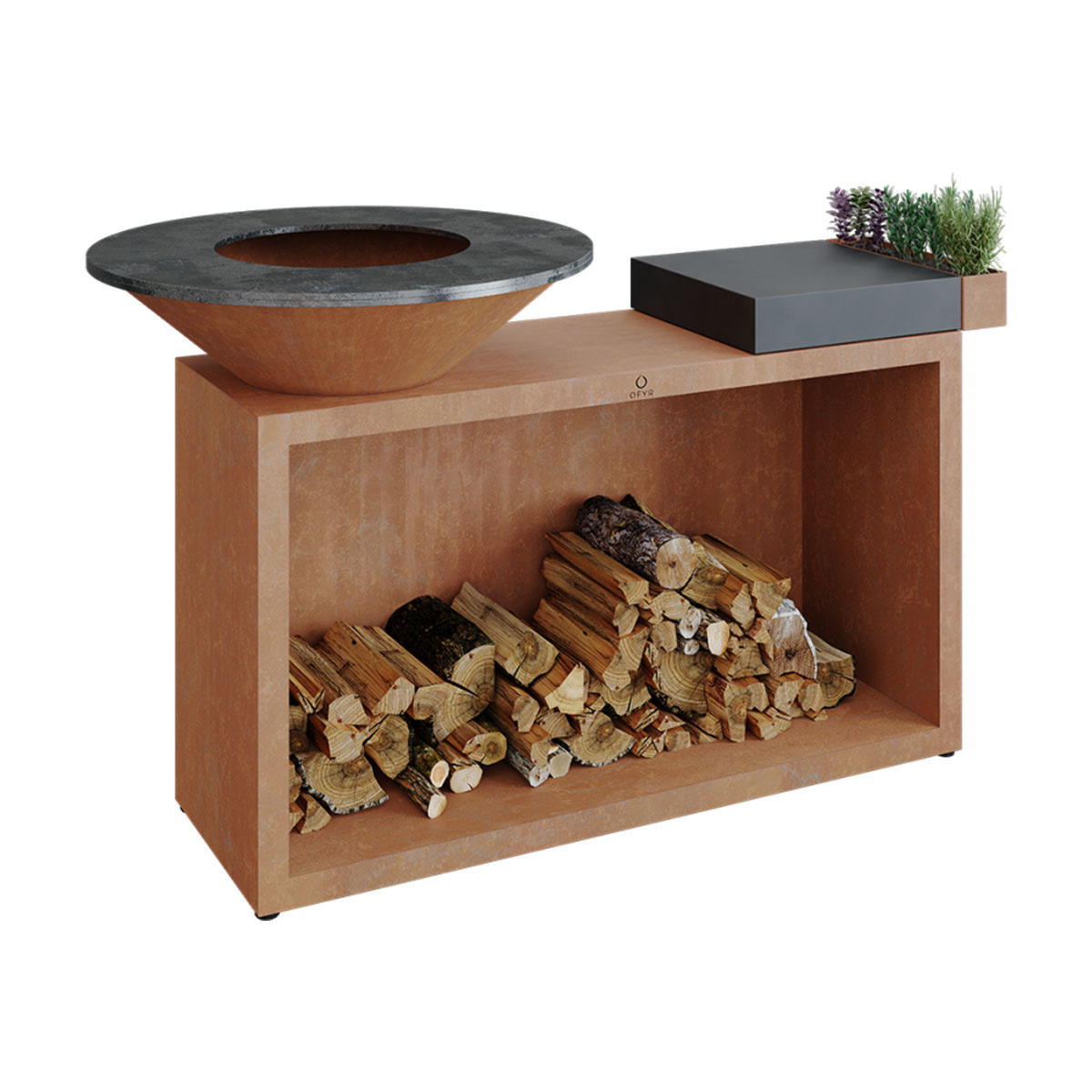 This all-in-one unit combines unbeatable style and functionality in a compact design. The OFYR Island provides everything you need for an ultimate outdoor cooking experience with friends or family. It includes an 85 cm or 100 cm OFYR cooking unit with wood storage, a chopping board and a handy accessories tray for utensils and condiments. The chopping board is available in teak wood or dark grey ceramic.