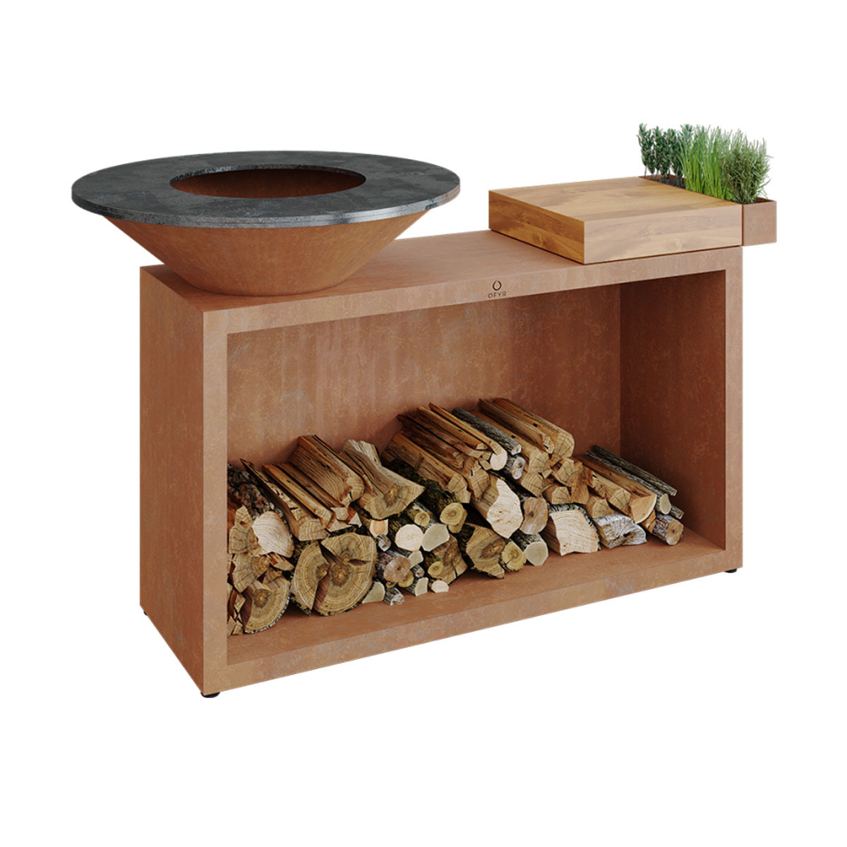This all-in-one unit combines unbeatable style and functionality in a compact design. The OFYR Island provides everything you need to have an ultimate outdoor cooking experience with friends or family. It includes an 85 cm or 100 cm OFYR cooking unit with wood storage, solid wood chopping board and a handy accessories tray for utensils and condiments. The chopping board is available in teak wood or dark grey ceramic.