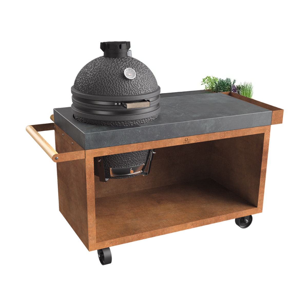 Expand your OFYR outdoor kitchen with an OFYR Kamado Table Corten 135 PRO BGE; a table for your Kamado grill. The table provides a solid foundation for your grill, is easy to move around and has space for mise in place. The additional storage space is handy to store your accessories. A Kamado grill is perfect for slow meat cooking. Kamado grills hold heat and smoke inside, which has an incredible impact on the food’s flavor. When the meat is properly cooked, you finish your dish grilling on OFYR – from slow-cooking to show-cooking. Suitable for the Big Green Egg Large, please note that the grill is not included. The chopping board is only available in teak wood.