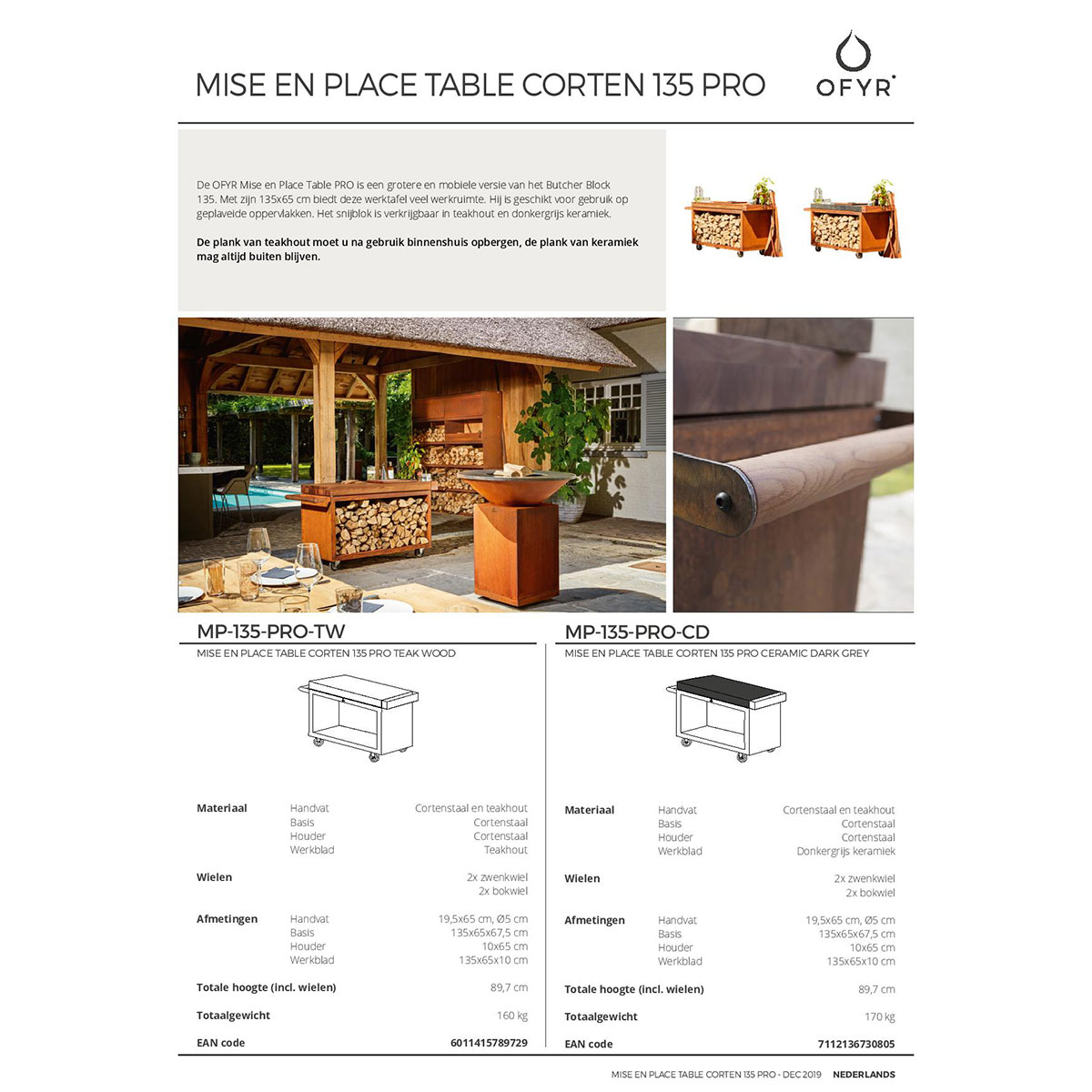 The OFYR Mise en Place Table Corten 135 PRO is incredibly handy to use with your cooking unit, allowing you more space to prepare your food. With the 135×65 cm, there is ample working space. The chopping board is available in teak wood and dark grey ceramic.
