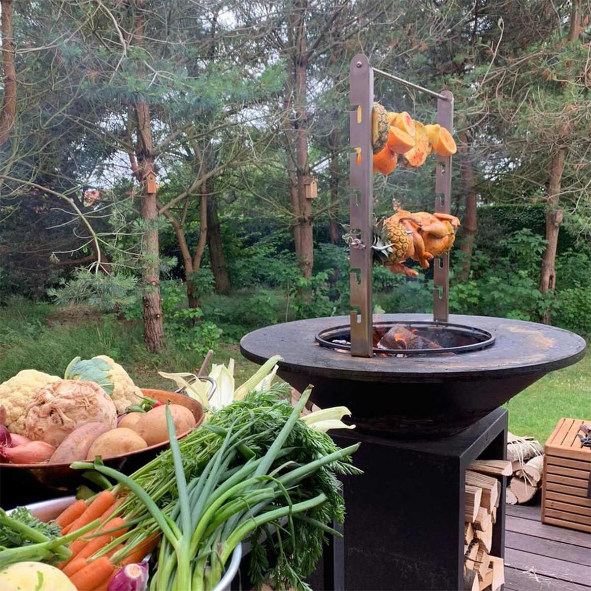 For the real barbecue fanatic a spit is a must. And what could be better than cooking large pieces of meat or poultry with a spit above the fire of the OFYR cooking unit or cooking delicious food in a hanging pan. The same set is offered for the OFYR 85 and 100. The set consists of 2 very solid stainless steel uprights, which are ingeniously fixed under the hob, 2 stainless steel intermediate tubes (1 for the 85 models and 1 for the 100 models) which connect firmly at the top of the uprights, a skewer with swivel hook with 2 large and 2 small holders for clamping the meat or poultry, and an S hook for hanging a pan. Because of the fire, the uprights, the intermediate tube and the skewer become very hot. It is therefore advisable to always operate the OFYR spit with heat-resistant gloves such as the OFYR gloves. To preserve the primal feel of the OFYR cooking unit, no motor to turn the spit is offered.