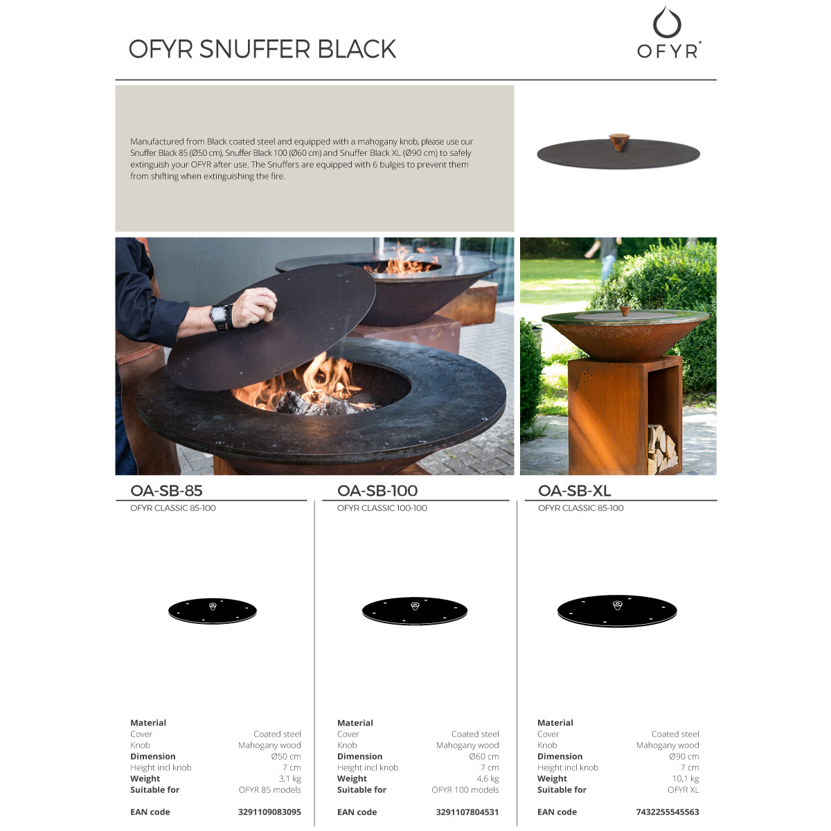 Manufactured from black-coated steel and equipped with a mahogany knob, please use our Snuffer Black 85 (Ø50 cm), Snuffer Black 100 (Ø60 cm), and Snuffer Black XL (Ø90 cm) to safely extinguish your OFYR after use. The Snuffers are equipped with 6 bulges to prevent them from shifting when extinguishing the fire.