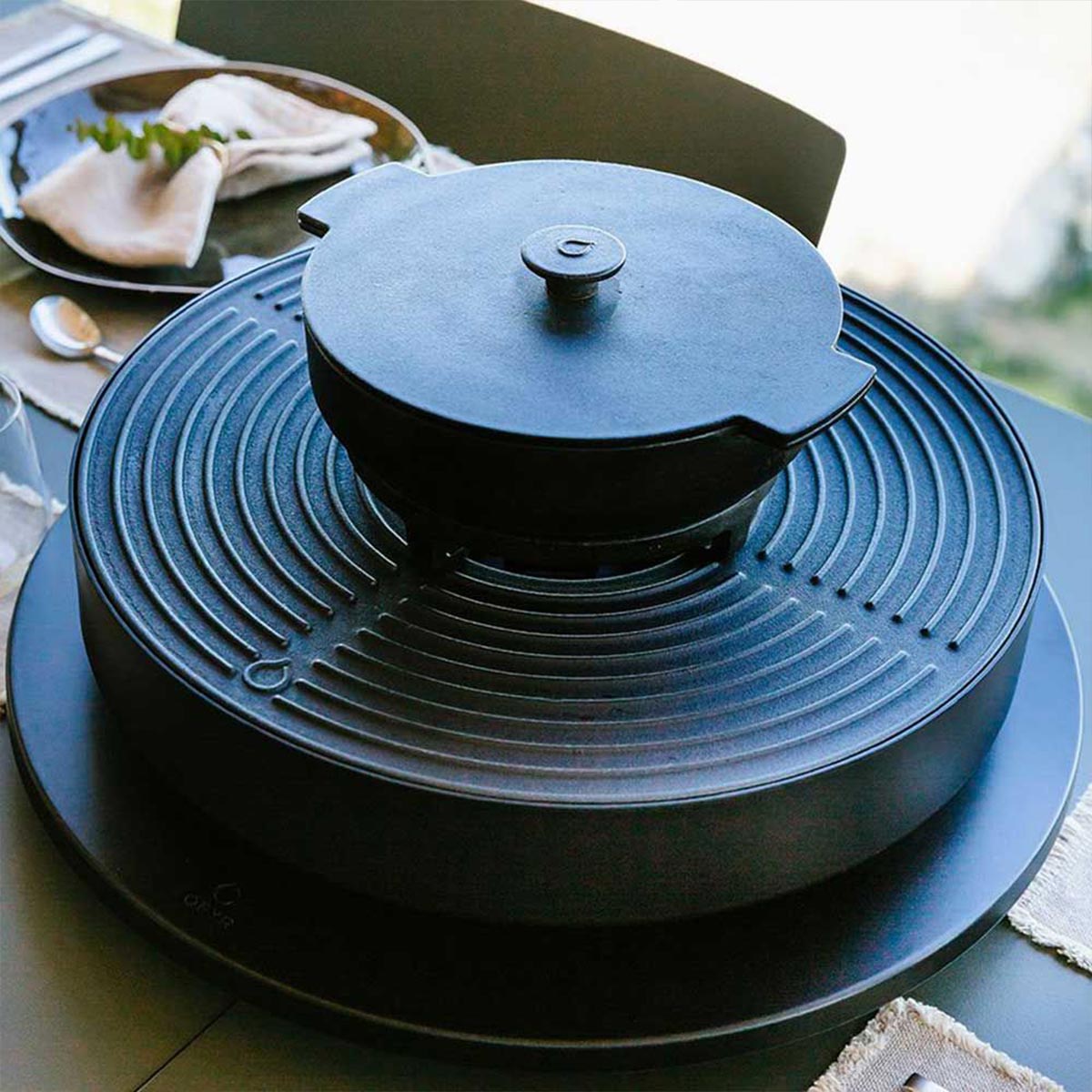 This set turns the OFYR Tabl’O table grill into a super complete outdoor cooking appliance. The set consists of a sleek cast iron pan with a lid with a diameter of 21cm, a cast iron grill holder with a loose cast iron grill grid, on which the pan fits exactly, and 4 wooden spatulas to scrape the plate clean. The pan can be used to prepare a multitude of dishes above the hot Tabl’O. Think for example of cheese fondue in the pan and at the same time vegetables on the plate. The grill holder with grill can also be used to grill small dishes when the grill grid is turned over.
