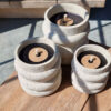 -Concrete: One of the materials we use for our outdoor candles is concrete. We try to take pride in using it all its shapes and forms. Always reinforced with fiberglass, it is sturdy, durable but always elegant. Whether it is coated concrete or natural, our concrete candles will never cease to amaze you with their unique style