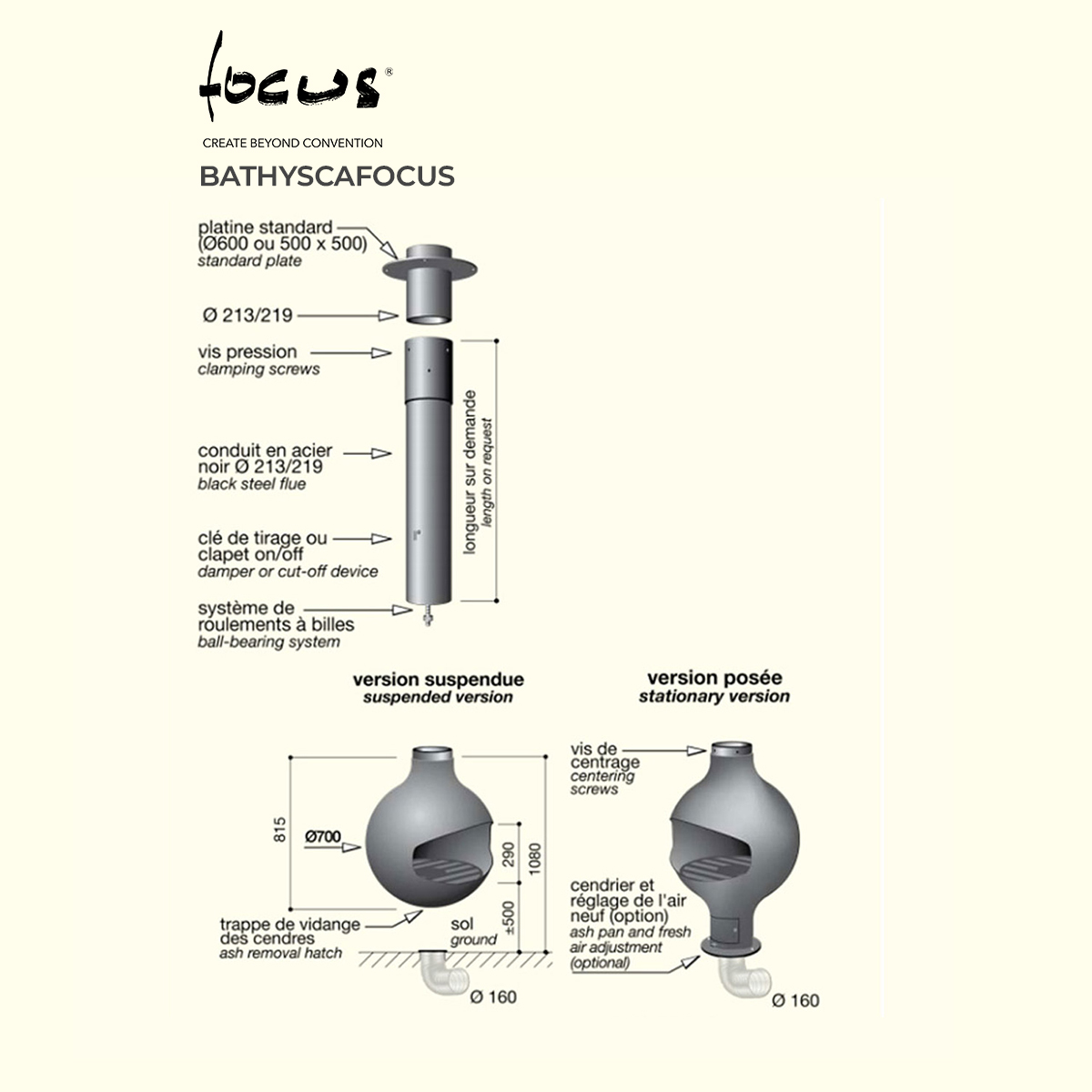 Outdoor model with a suspended and pivoting hearth.