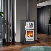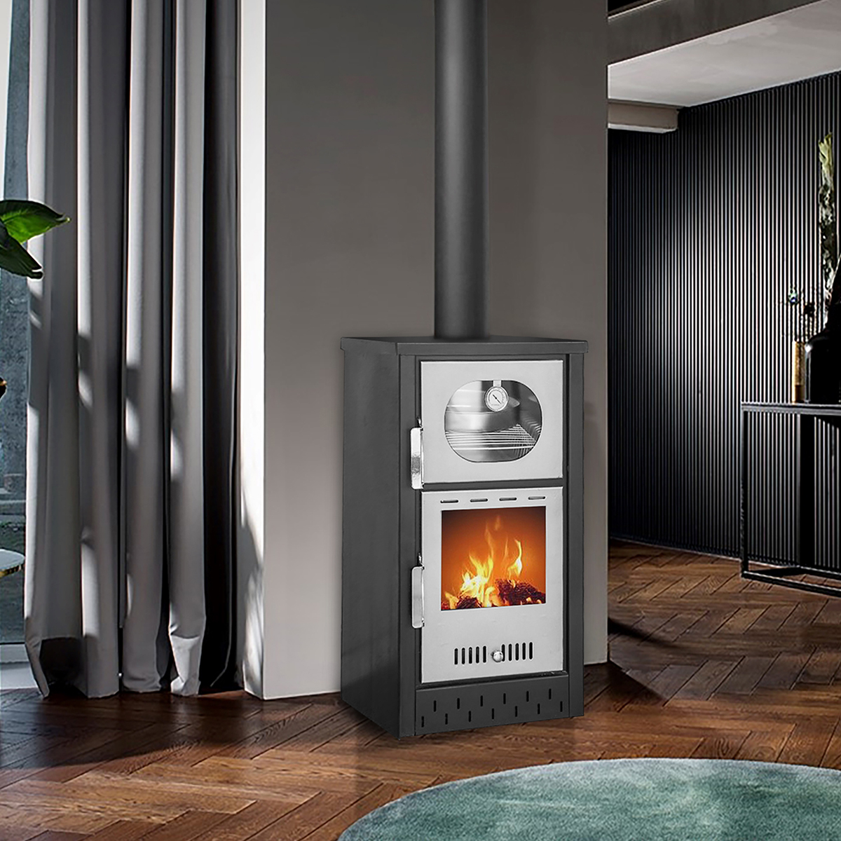 At the same time it is used for baking. Its oven is enameled and contains an inox tray and grill.