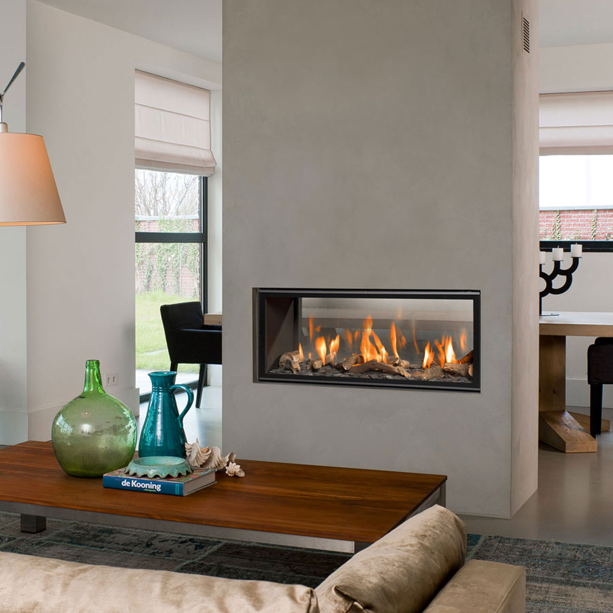 Compact double-sided fireplace, designed for efficient heating and modern aesthetic appeal in smaller spaces.