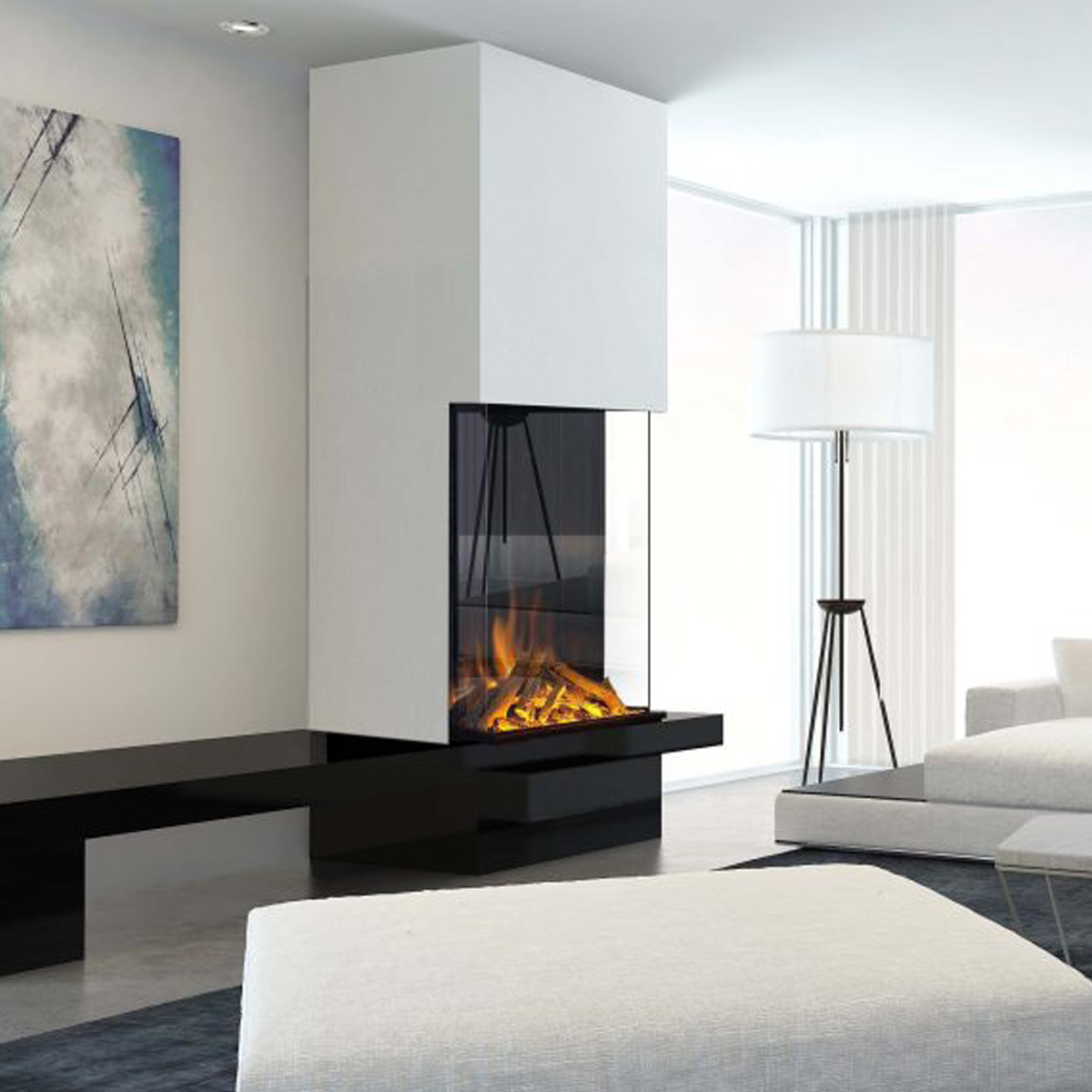 Multi-sided electric fireplace that offers a captivating view of the flames from various angles.